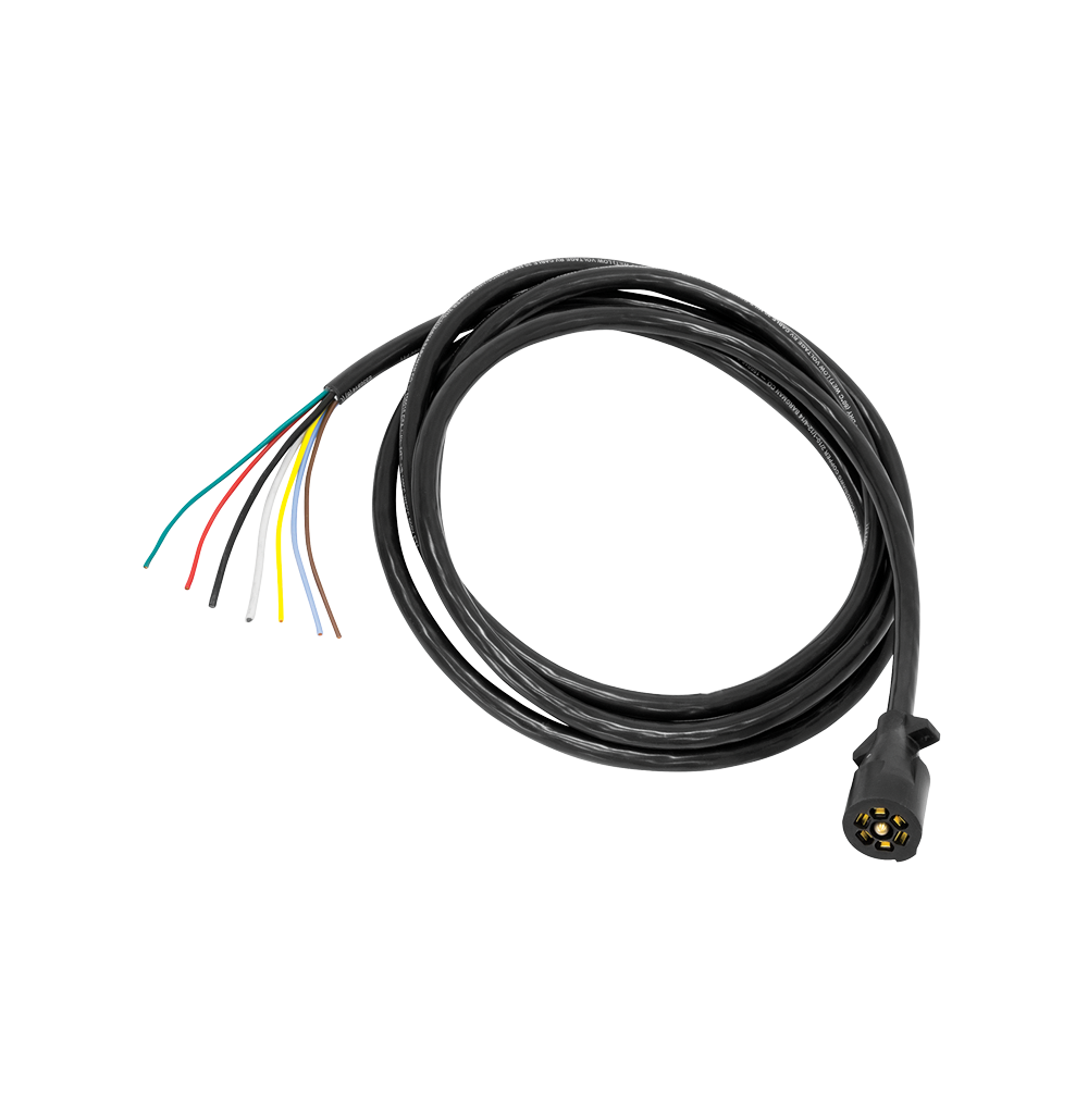 7-way plastic trailer connector molded to heavy duty 7-way insulated cable. Made with self-cleaning contacts and molded to encapsulate terminals and wires to form one weather resistant, not-corrosive assembly.
