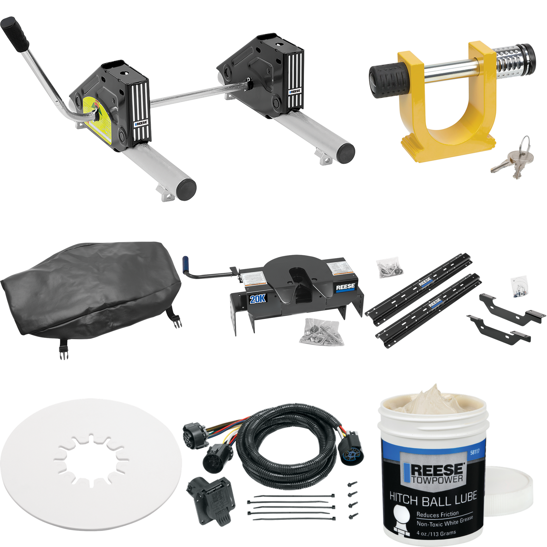 Bundle Info: Fits 2011-2019 GMC Sierra 3500 HD Custom Outboard Above Bed Rail Kit + 20K Fifth Wheel + Round Tube Slider + In-Bed Wiring + King Pin Lock + Base Rail Lock + 10" Lube Plate + Fifth Wheel Cover + Lube (For 6-1/2' or Shorter Bed, Except w/OEM HD Towing Prep Package, w/o Factory Puck System Models) By Reese